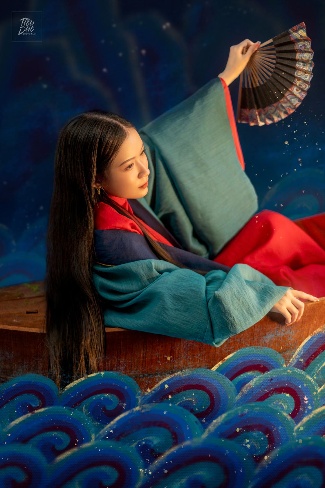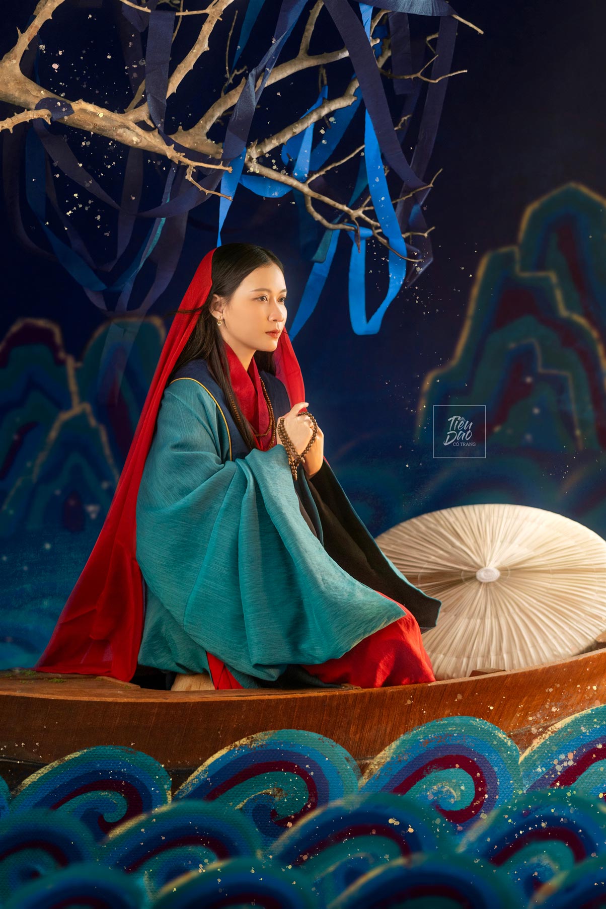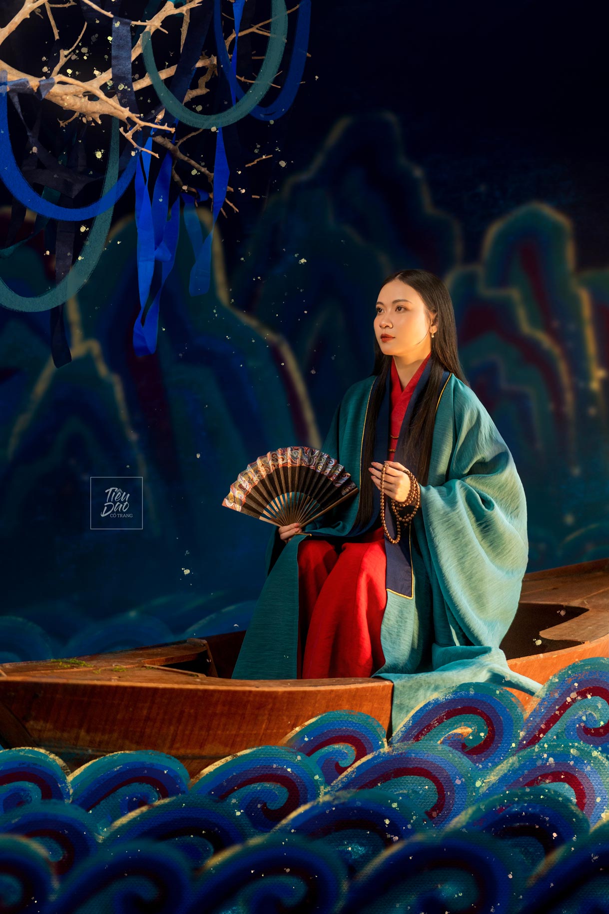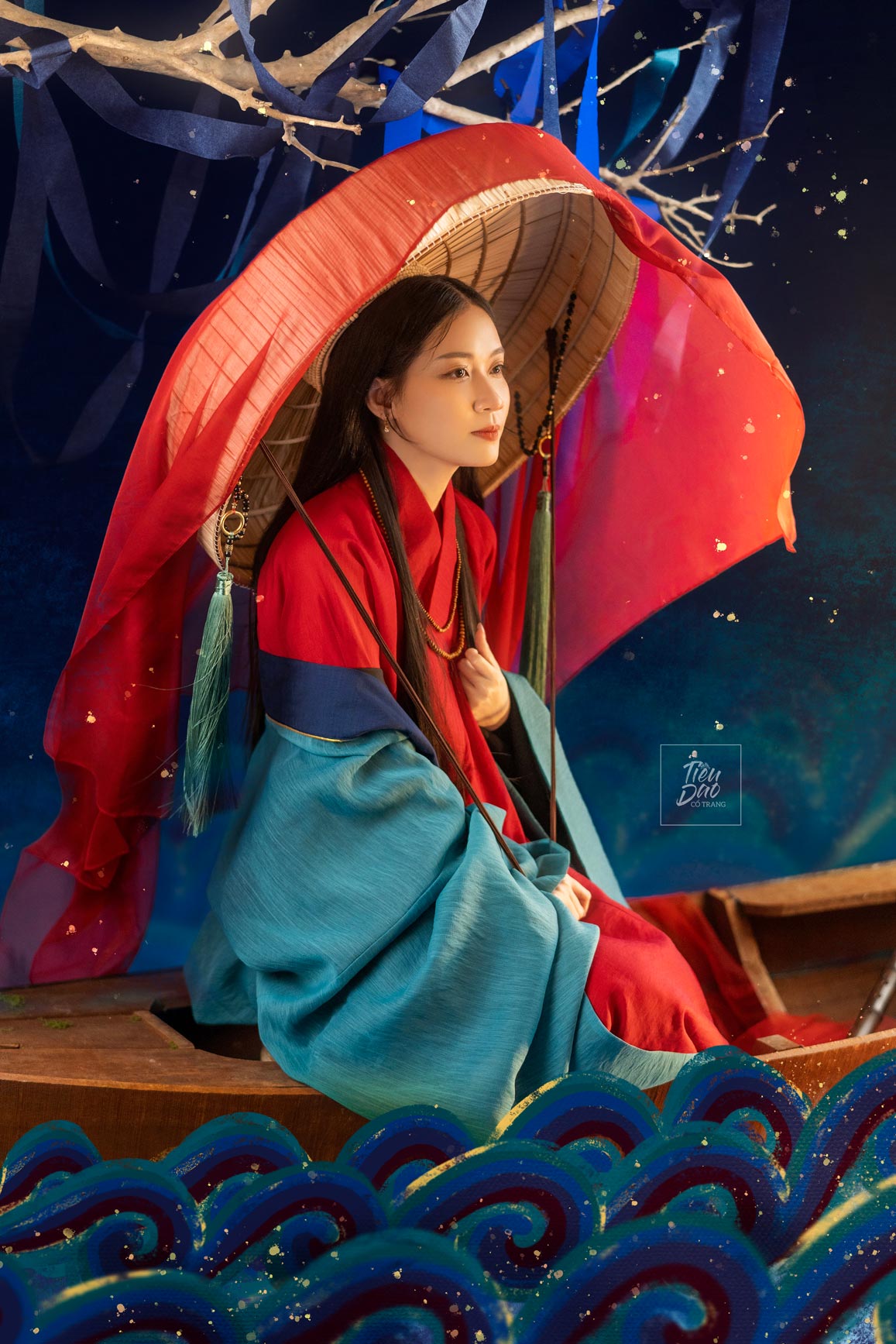 Bộ ảnh “U Hà Dạ Hành” là một trong những ví dụ tiêu biểu cho sự kết hợp hài hòa giữa nghệ thuật thị giác hiện đại và vẻ đẹp cổ điển của chụp ảnh Việt cổ phục, mang đến một không gian giàu tính tự sự, lãng mạn và đầy chất thơ. Lấy cảm hứng từ dòng chảy văn hóa truyền thống, bộ ảnh sử dụng trang phục truyền thống Việt Nam – cụ thể là mẫu áo giao lĩnh – đối khâm mang tên “Thủy Ba” – để kể nên câu chuyện về một nhân vật nữ bước vào hành trình huyền ảo giữa đêm nước mênh mang. Màu sắc chủ đạo của trang phục, gồm đỏ, xanh lam và xanh ngọc, kết hợp với ánh sáng vàng dịu, tạo nên cảm giác vừa cổ điển vừa linh hoạt, gợi nhớ những bức họa dân gian nhưng vẫn phù hợp với thị hiếu thị giác hiện đại. Khi đưa vào khung cảnh sông nước với những lớp sóng được vẽ cách điệu, bộ ảnh tạo ra một thế giới mộng ảo nơi thực và ảo giao hòa, đúng với tinh thần “dạ hành” – chuyến đi trong đêm sâu thẳm và tĩnh lặng.