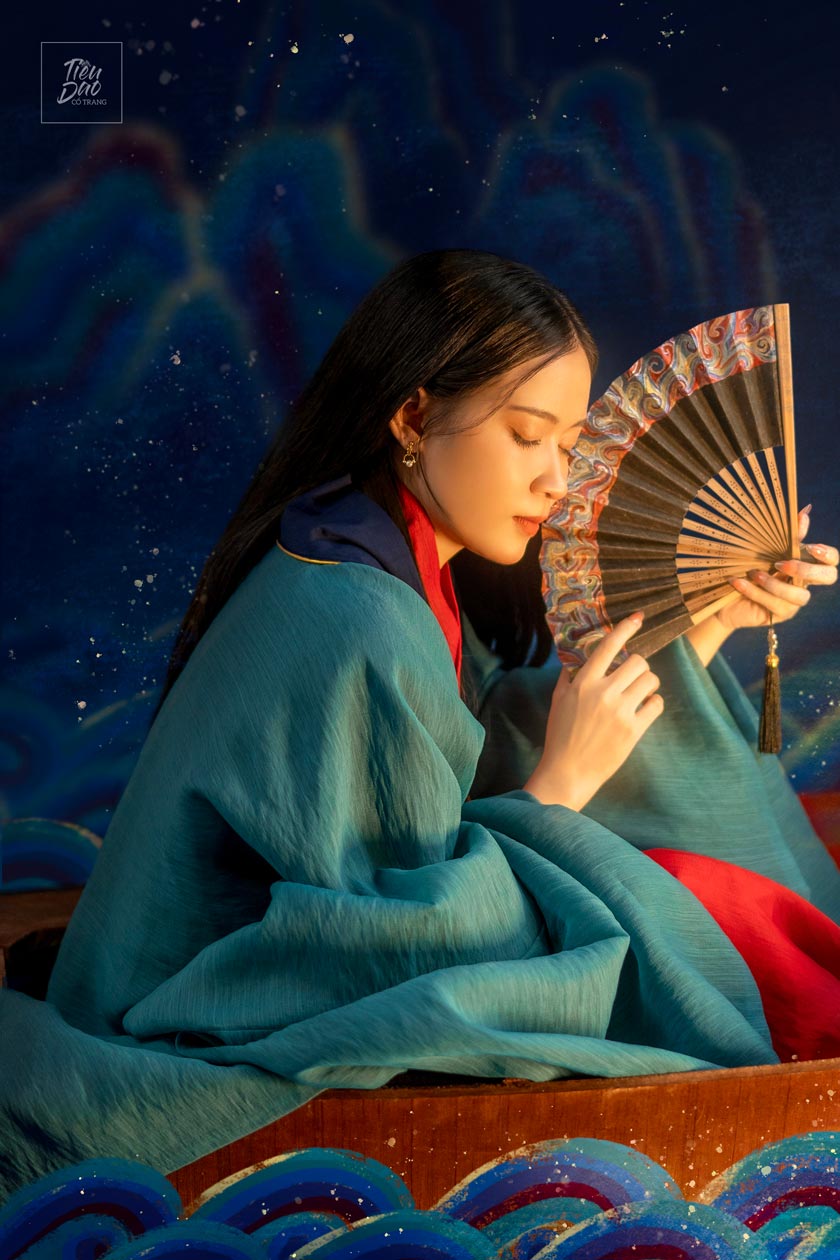 Về phương diện trang phục, mẫu “Thủy Ba” tái hiện đúng tinh thần của áo giao lĩnh – đối khâm truyền thống. Phom dáng rộng, hai vạt giao nhau, cùng tay áo dài buông mềm là những chi tiết gợi nhắc thời Lý – Trần, một giai đoạn văn hóa Việt Nam thịnh vượng và giàu bản sắc. Màu xanh của áo khoác ngoài tượng trưng cho mặt nước yên bình, trong khi sắc đỏ của áo trong thể hiện sự sống, sự chuyển động và nội lực của nhân vật. Cách phối màu tương phản nhưng hài hòa này giúp bộ ảnh không chỉ đẹp về mặt thị giác mà còn có chiều sâu biểu tượng. Khi kết hợp với các phụ kiện như nón lá lớn, quạt gỗ, vòng chuỗi và dây tua lục, hình ảnh nhân vật trở nên đầy tính nghi lễ nhưng vẫn mềm mại và uyển chuyển.