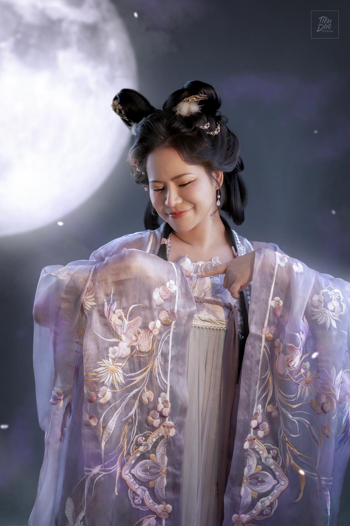 Không gian chụp ảnh được dàn dựng công phu với hậu cảnh là mặt trăng tròn sáng giữa bầu trời đêm, kết hợp cùng làn sương trắng bồng bềnh, tạo nên hiệu ứng “tiên cảnh” mơ màng. Ánh sáng trong bộ ảnh được xử lý theo tông lam tím pha ánh bạc, giúp nổi bật nước da và tà áo, đồng thời gợi cảm giác huyền ảo của đêm trăng cổ. Đây là một trong những yếu tố quan trọng giúp bộ ảnh đạt chuẩn của một concept cổ trang thành công – khi yếu tố ánh sáng và bối cảnh không chỉ làm nền mà còn trở thành phần kể chuyện, giúp người xem cảm nhận được không khí lãng mạn, trầm tĩnh của thời xưa.